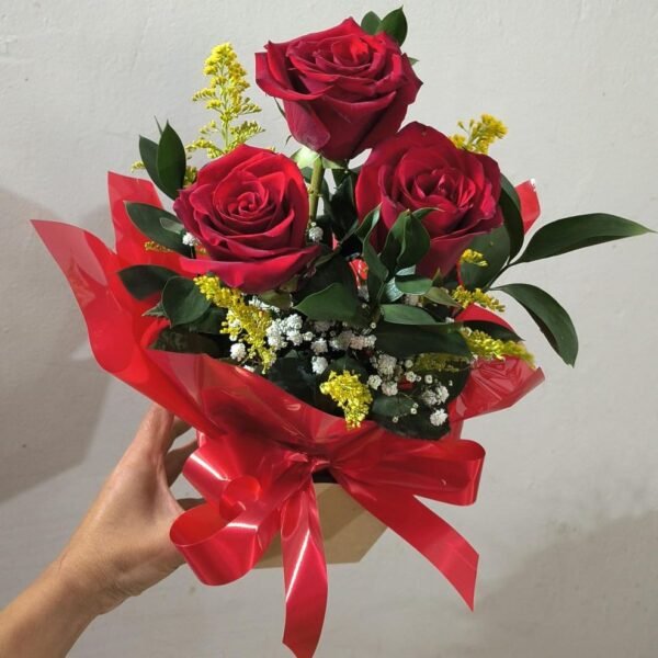- 03 Rosas Vermelhas Importadas: Rosas premium de botões grandes, selecionadas pelo frescor e cor intensa.