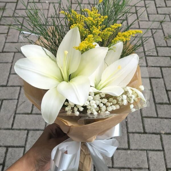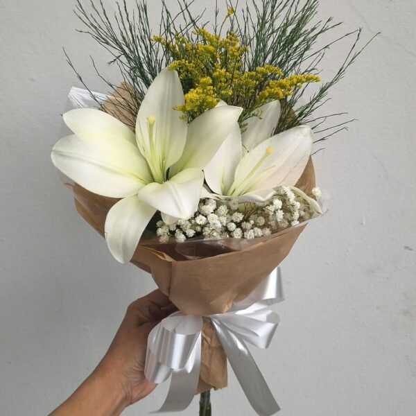 O Buquê Simples de Lírios Brancos é a representação perfeita da elegância sutil. Com suas flores delicadas e brancas como a neve, este buquê traz um toque de sofisticação para qualquer ocasião. Ideal para presentear ou decorar ambientes, ele transmite calma, serenidade e um charme atemporal.